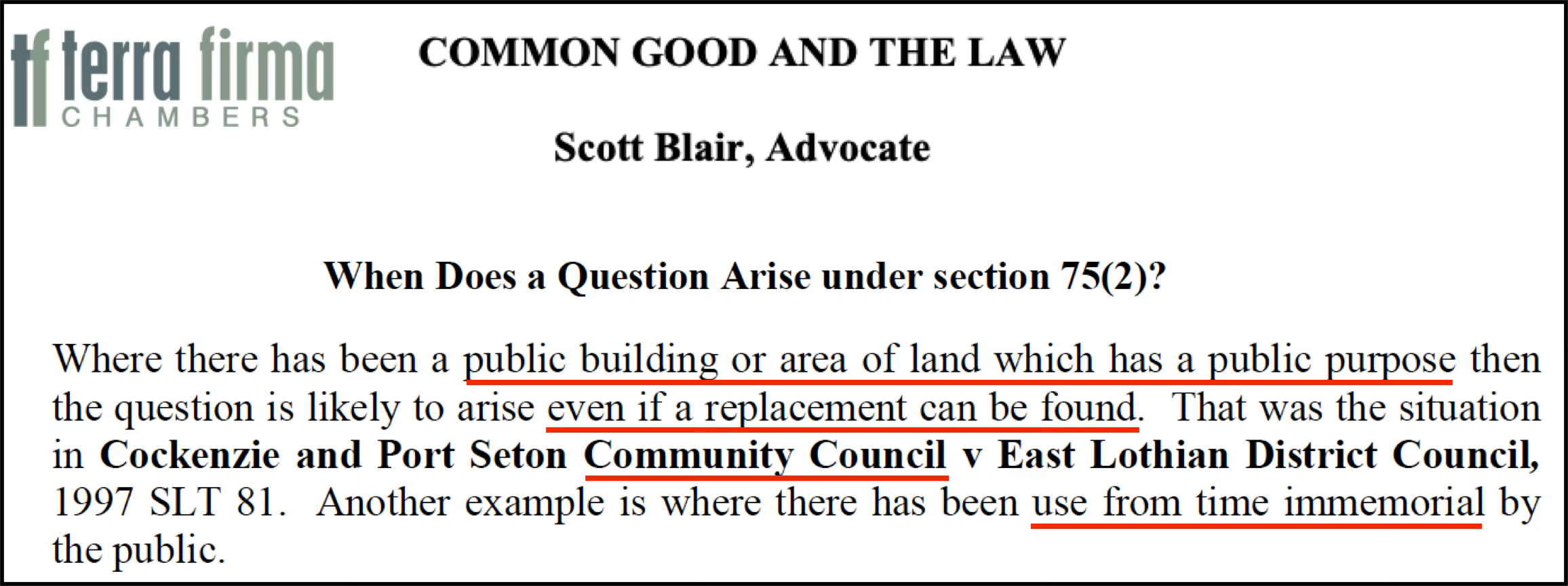 The classification of Parkhead as ‘alienable’ common good land is highly dubious. In his article Common Good and the Law, Scott Blair, member of the Terra Firma Chambers Scottish Faculty of Advocates, states that s75(2) (and thereby the requirement to apply to court for sheriff’s permission) is likely to apply ‘Where there has been a public building or area of land which has a public purpose’ or ‘where there has been use from time immemorial by the public’.